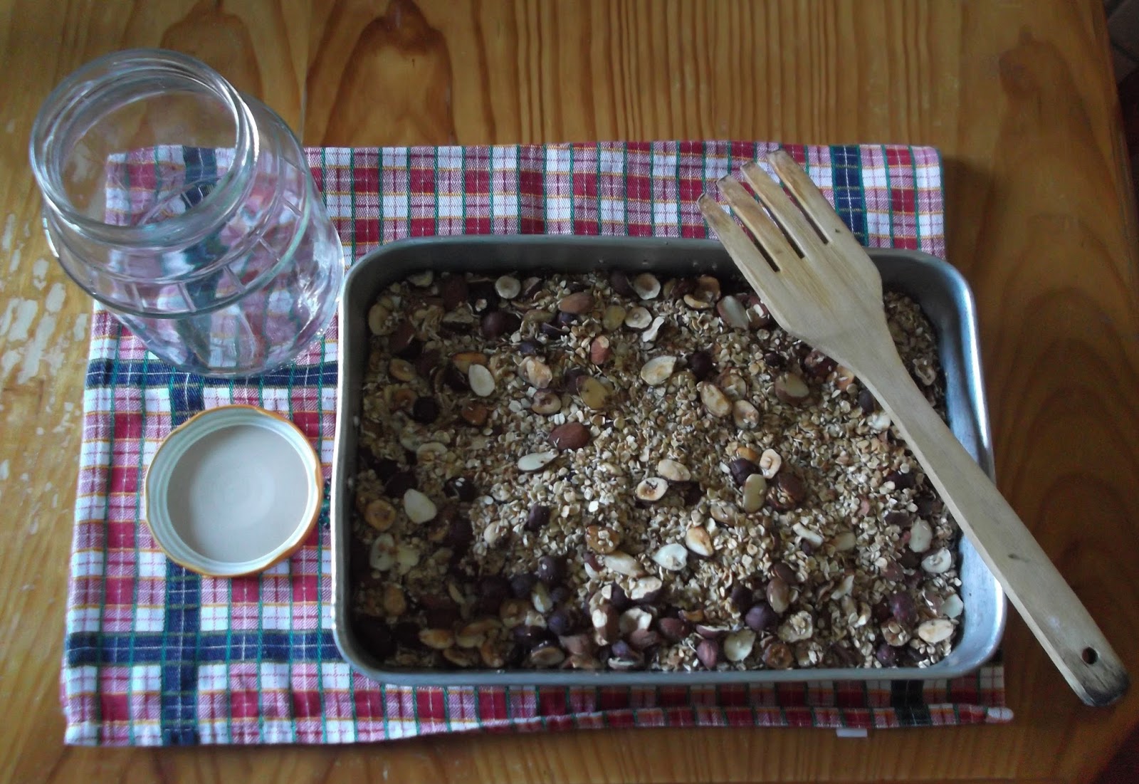 Leve ao forno para ir tostando (o tempo depende de como gosta da granola: para mim é mais escurinha e bem tostadinha - para ficar crocante), mexa de 15 em 15 minutos (com uma colher de pau) para revolver bem a granola e fazer com que toste toda por igual.