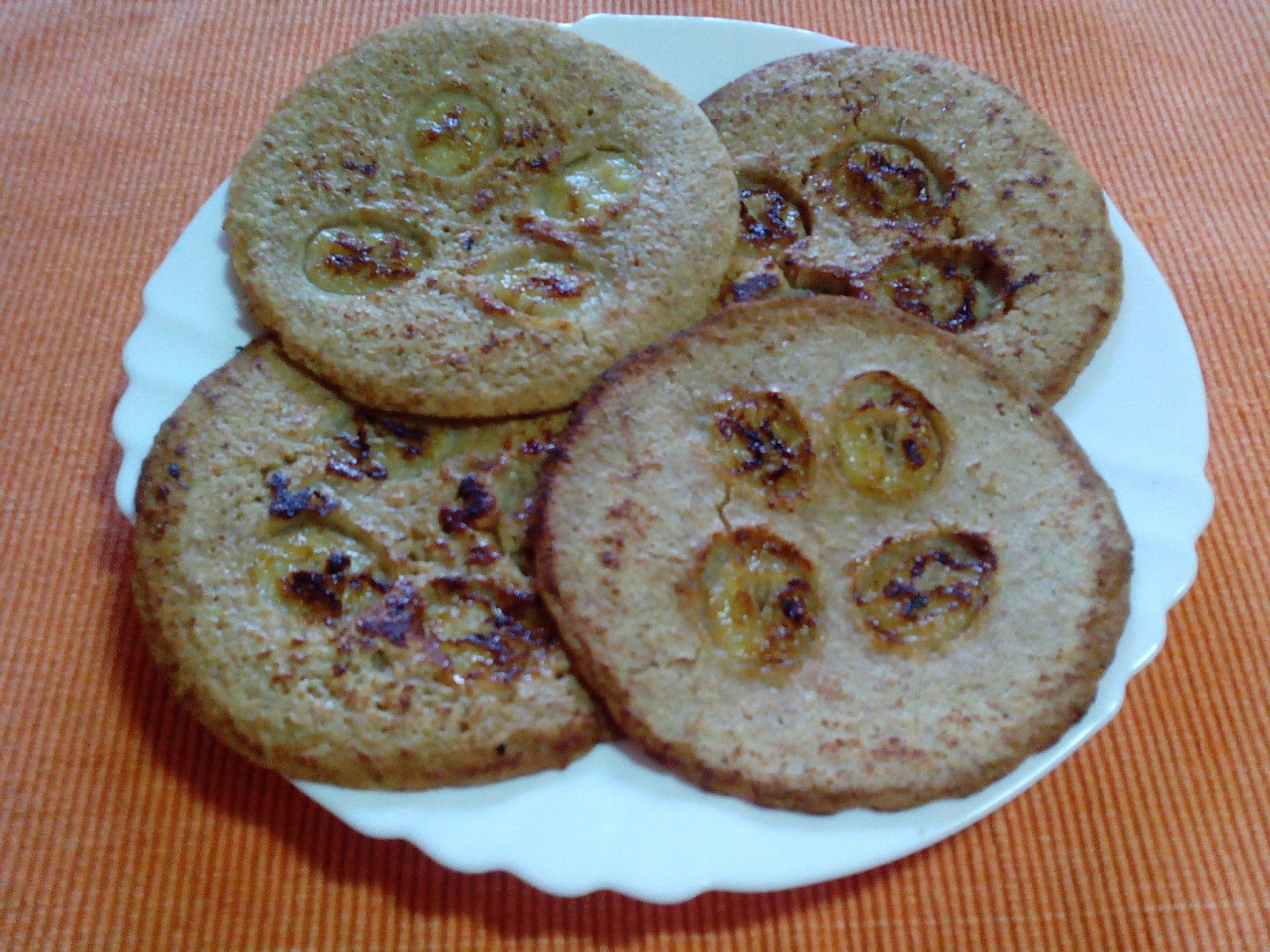 Coloque uma pequena noz de manteiga numa frigideira antiaderente pequena. Leve ao lume e assim que estiver quente coloque uma porção de massa a cozinhar. Coloque rodelas de banana (coloquei 4) na massa, vire assim que estiver cozida o suficiente. Deixe cozer desse lado (cuidado que banana carameliza e pode colar, tem de se ir abanando a frigideira para evitar isso).